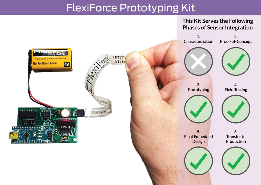 The FlexiForce™ Prototyping Kit allows you to efficiently progress your FlexiForce-embedded design through advanced integration phases. |
