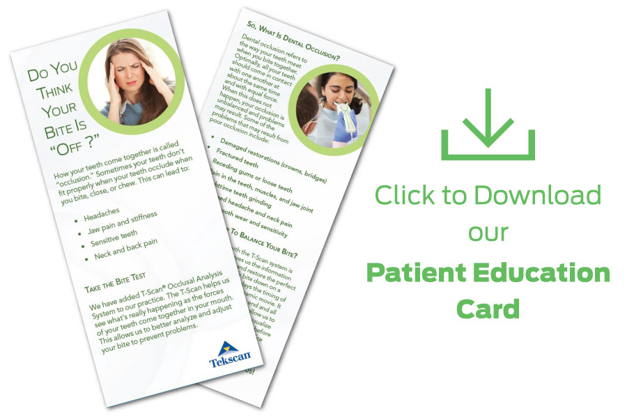 Our Patient Education Card is a simple takeaway piece you can have at your office. It provides a quick introduction into occlusion, and explains how T-Scan can help shed light on their discomfort or challenges relating to their bite.