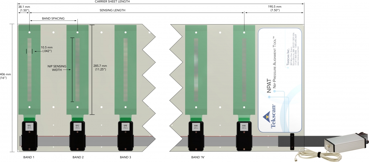 The NPAT is used to capture nip footprints and relative pressure distribution between nip rolls. The NPAT sensor band array can cover a very large area while utilizing one data acquisition handle.