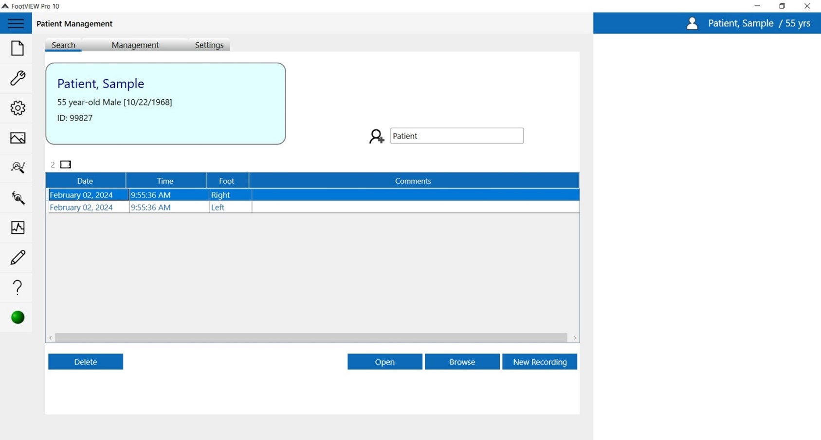 The FootVIEW Patient Management provides an interface for organizing and storing pressure sensor recordings. The system stores a list of patients and automatically stores pressure recordings into folders linked to each patient record. Recordings collected for each patient may be accessed and opened for analysis through the patient’s record.