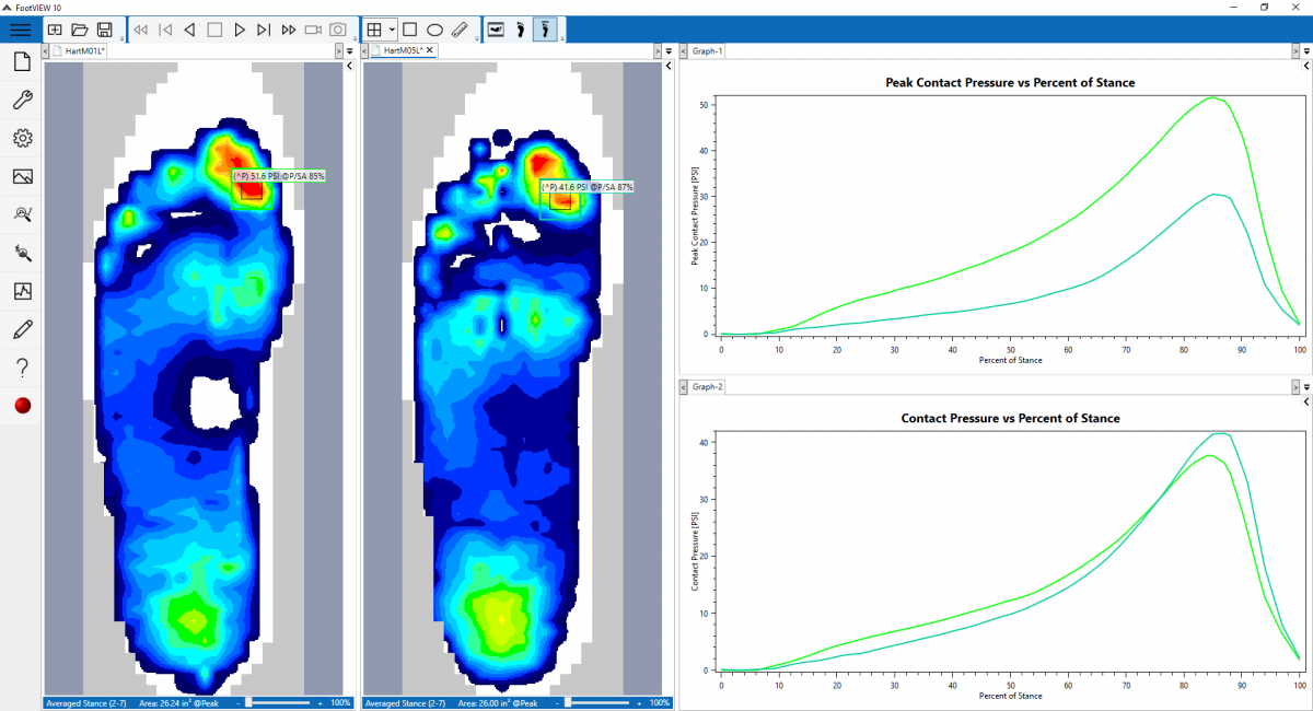 FootVIEW Pro includes all the functionality of FootVEW with additional features designed for dynamic activities and research in a biomechanics library