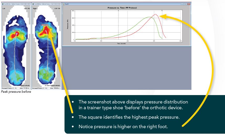 The screenshot to the right displays pressure distribution in a trainer type shoe only "before" and with the orthotic device "after."